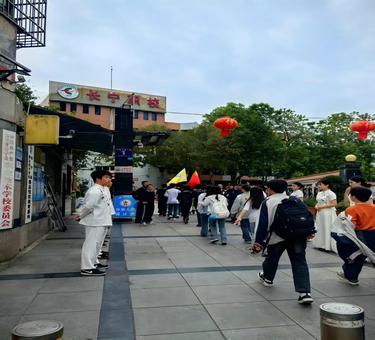 本次研学活动以“美丽长宁·我爱家乡”为主题,竹海中学初三师生共计333人于当日上午8时从竹海中学列队出发,沿竹海大桥、翡翠大道、城西路,徒步约7公里抵达四川省长宁职业技术学校。行进途中,同学们精神饱满,自觉遵守交通规则与安全纪律,展现出良好的精神风貌与吃苦耐劳的意志品质。长宁职校接待组在校门口热烈迎接,引导师生有序入校。