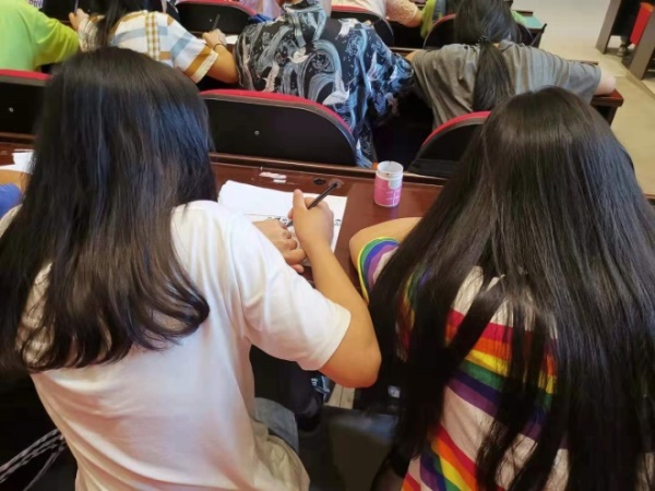同学们在心理辅导活动中认真绘画、展望未来