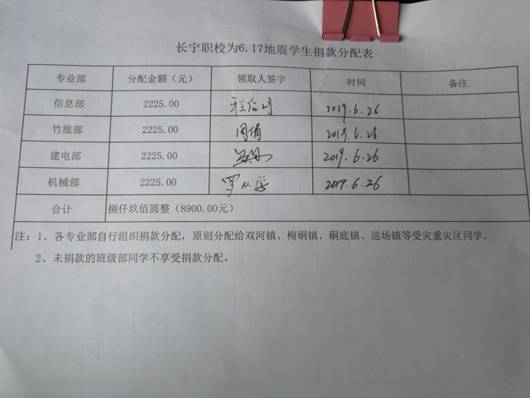 “一方有难,八方支援",为向学校受灾严重的同学表达爱心。为抗震救灾,帮助灾区同胞重建家园助力。我校团委第一时间组织全校为6.17地震捐款的活动,校团委书记在课间操宣读了捐款倡议书,各班团支部书记负责到班宣传并组织学生捐款活动。截止2019年6月26日,共收到学生捐款共8870元,现以将捐款分配到学校四个专业部,由专业部了解学生受灾情况并将捐款捐给受灾严重的学生。