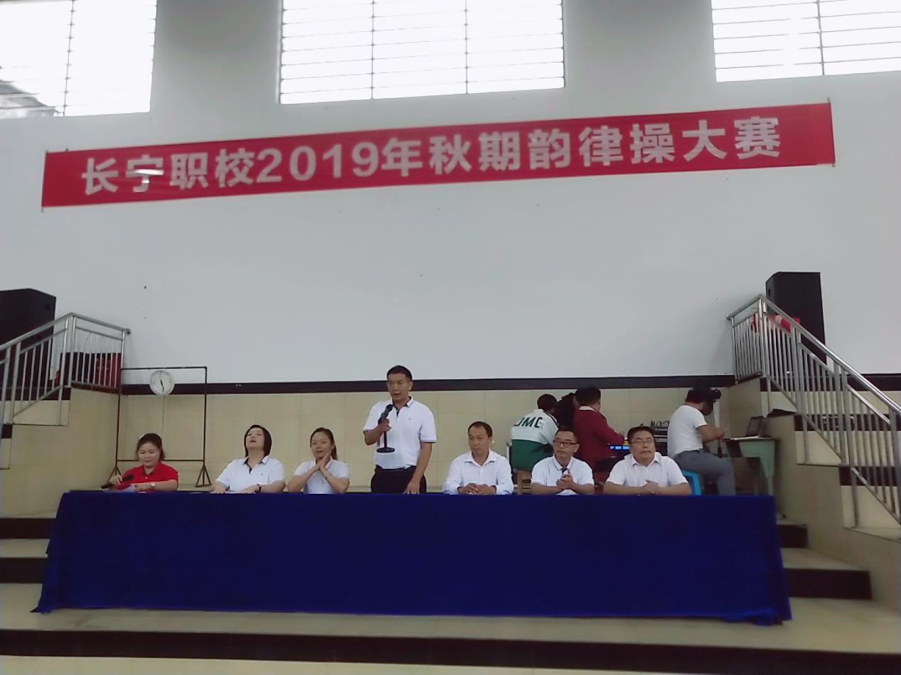 长宁职校党总支书记、校长潘明剑宣布长宁职校2019年秋期韵律操比赛开始。