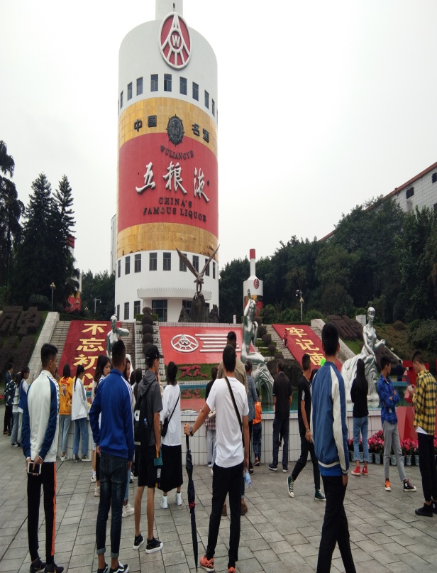 早上9点,满怀激情的同学们乘上长宁环球旅行社的大巴车开启了今天的游学旅程。车上,导游向大家简要介绍了五粮液集团的名称由来、行业地位和上午的行程安排,使同学们对即将参观的五粮液集团有个初步了解。经过一个小时的奔波,车子顺利到达五粮液集团的东大门,同学们在导游的带领下,先后参观了鹏程广场——酒圣山——酒文化博览馆。每到一个参观点,同学们都会认真聆听导游的解说,对标志性建筑大家怀着崇敬的心情仰望并纷纷拍照留影,留作纪念。
