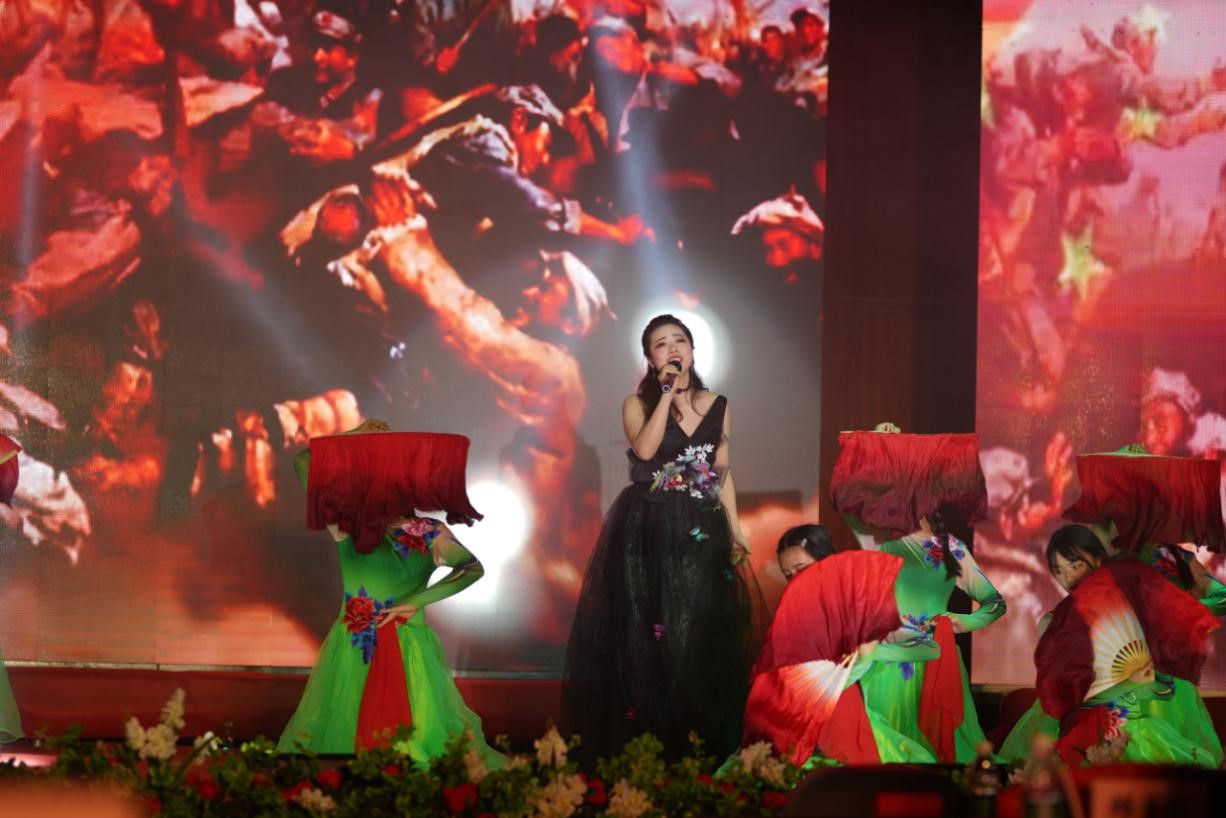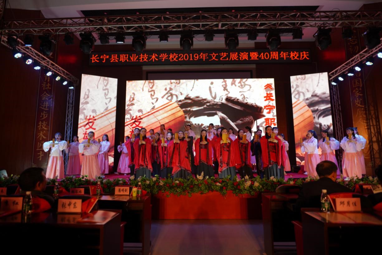 之后,精彩的文艺演出拉开了帷幕,整场演出由9个节目组成。《长宁职校校歌》《我和我的祖国》还原长职人艰苦奋斗、自强不息的豪情壮志和爱国情怀;《乐舞丹青》集古筝、插花、舞蹈、书画于一体,显示了技术与艺术的融合;《诗经.木瓜》《长宁职校赋》是语文教师们带来的传统文化、校园文化的集中展示;《星火相传》是对长宁县“6.17”地震的悼念……节目最后,一曲《我的中国心》将演出推向高潮,引得嘉宾共鸣。
