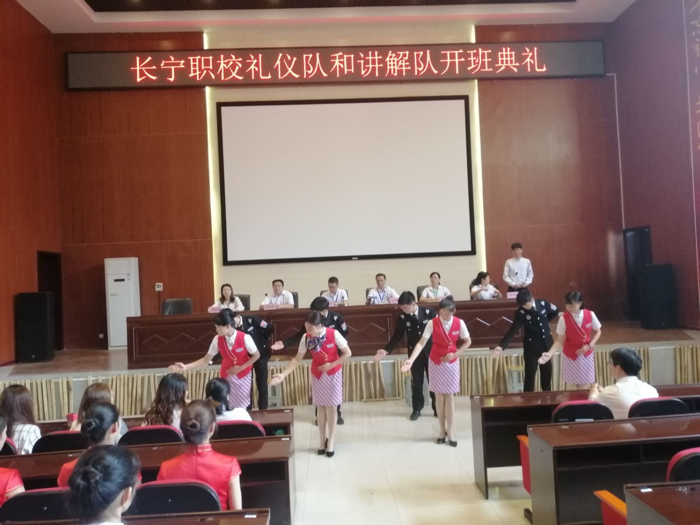 典礼伊始,礼仪队同学带来了基本航空礼仪展示和拉丁舞表演,老师们和同学们看看津津有味,掌声不断。随后,学校校长王运兵对礼仪队和讲解队的同学们提出了中肯的建议和殷切的希望,希望同学们讲礼仪,重礼仪,成为礼仪知识的学习者、传播者和践行者,形成以个人带动班级,班级带动专业部,专业部带动学校的良性循环。随后党总支副书记王海彬着重对讲解队提出了要求和建议,老师们和同学们都受益匪浅,纷纷表示有信心、有能力为更多更优秀的学生提供成长和发展的平台。再次,樊华成部长和唐雪梅老师都对礼仪队和讲解队提了具体的更为细致的要求,也对训练的时间作了安排。最后,副校长周训冬宣布长宁职校礼仪队和讲解队正式开班!