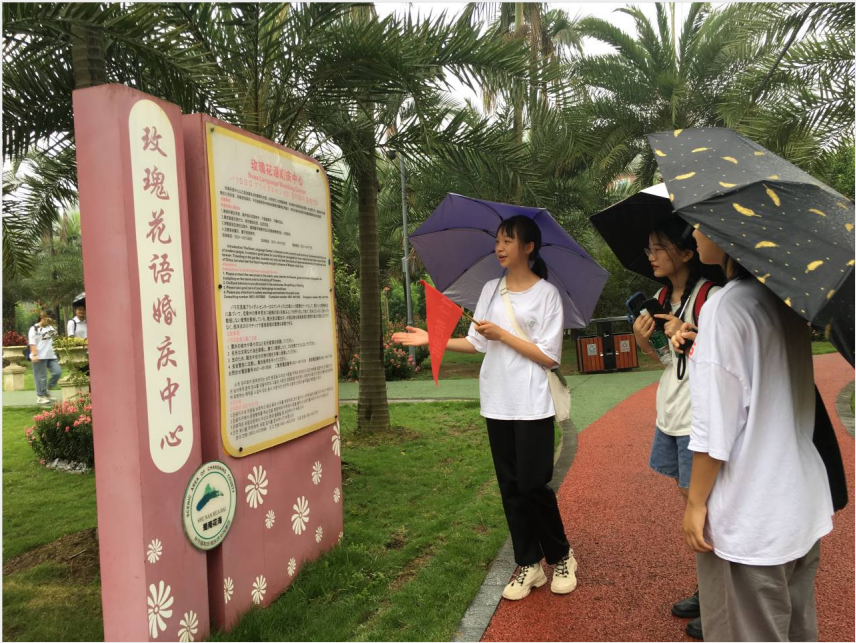 早上9点,师生们乘坐着4辆旅游大巴车,来到了蜀南花海景区,尽管天空下起了雨,依旧没有改变同学们的热情,一下车,就按分好的小组,在带队老师和小组长的带领下,依次进入景区,前往了景区内的各处景点,如月亮湾、玻璃桥、梦幻半岛、风铃长廊等等,分小组进行模拟导游讲解。此次活动,有别于往常的是,让同学们自行带着手机,每个人都参与进来,在讲解时互相录像,再观看录像,了解自身不足。起初,面对镜头大部分同学都较为紧张,但在同学们的相互鼓励以及过路游客的夸赞之下,渐入佳境,以旅游专业学生的专业素养,展示出了自身的专业风采。