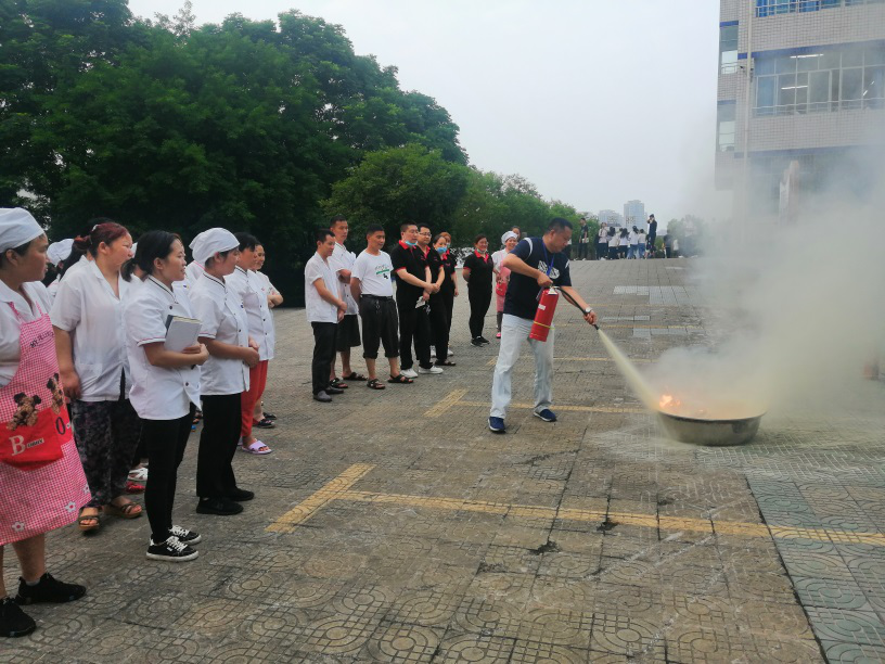 首先,安办主任周涛结合学校食堂的实际情况,对培训人员就可能发生火灾的主要原因、种类、预防措施、处理办法及消防器材的正确使用与保养等内容进行了具体的讲解与指导。随后进行了消防灭火操作现场演练。