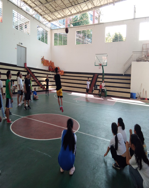 活动的第二个部分是开展庆端午联欢活动。在学校体育馆里,王校长、熊副校长、驻校教师魏张和9+3办公室人员陪同学生们进行跳绳、拔河、翻纸牌、定点投篮等趣味比赛。全体同学积极参与比赛,欢声笑语不断萦绕在体育馆上空。