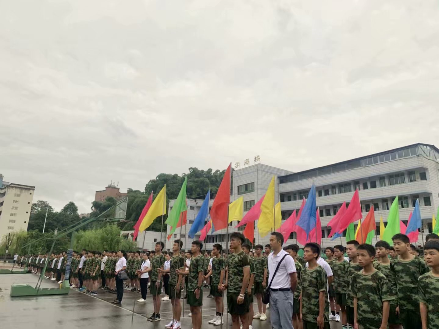 早上7:30,所有学生齐聚操场参加军训开营典礼,出席此次典礼的领导有:长宁县人民武装部部长刘晓,长宁县职业技术学校党总支书记、校长王运兵,党总支副书记王海彬,副校长熊鸿焰,副校长周训冬,纪检特派员曾涛,工会主席龙碧容。