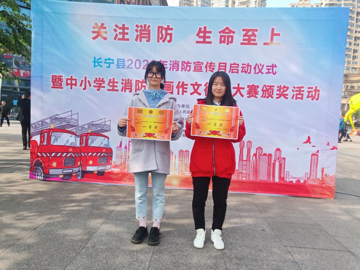 2020年11月6日,在长宁教体局,长宁县消防大队联办的2020年消防宣传月启动仪式上,举行了“关注消防 生命至上”为主题的中小学消防绘画作文征文大赛颁奖活动。领导们为获奖学生代表颁奖,并表示祝贺。我校获奖学生代表黄渝岚、张玲参加了颁奖仪式。