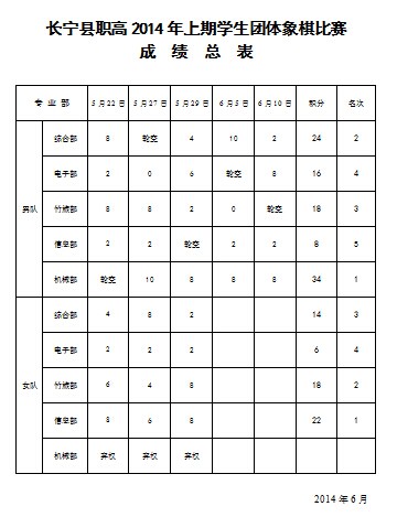 2014年6月10日下午五点,随着电子部对信息部、综合部对机械部男队的比赛结束,本次全校学生象棋团体比赛就全部结束了。整个比赛历时近20天,各专业部认真组织,积极参与,除了机械专业部目前因女生只有4人无法组队报名参加外,各队均认真筛选精英男女组队参赛。比赛中组织有序,学生守纪,态度端正,比赛激烈,取得圆满成功。