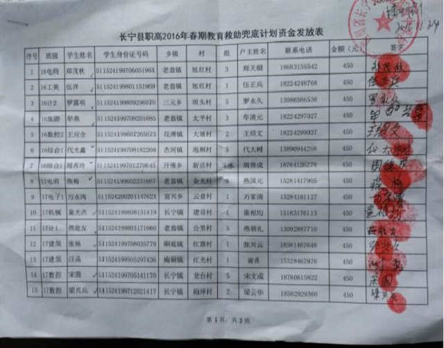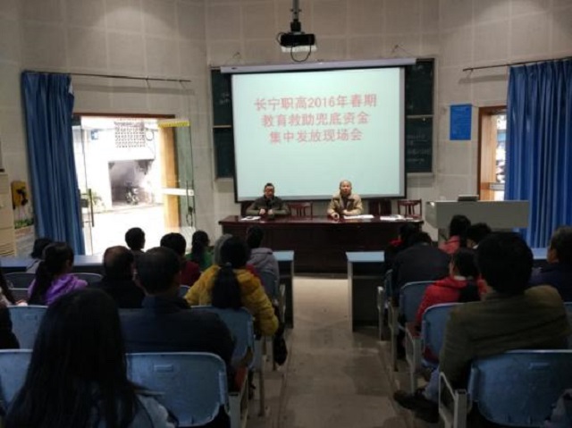通过层层审核 、确认,长宁职高2016年春期共41名建档立卡贫困户子女符合享受国家教育救助兜底计划条件;当天参加资金发放现场会的学生及家长共60余人,按照国家450元/生的教育救助标准,当天发放资金41人共18450元整,所有学生一次性足额领到国家救助资金。