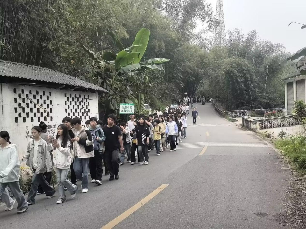 本次研学活动以“美丽长宁·我爱家乡”为主题,竹海中学初三师生共计333人于当日上午8时从竹海中学列队出发,沿竹海大桥、翡翠大道、城西路,徒步约7公里抵达四川省长宁职业技术学校。行进途中,同学们精神饱满,自觉遵守交通规则与安全纪律,展现出良好的精神风貌与吃苦耐劳的意志品质。长宁职校接待组在校门口热烈迎接,引导师生有序入校。