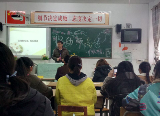 事情的经过原来是这样的。该班是本期由两个班组成的新班级,班级里的学生都是有意参加18年高考的,但是学生们的文化基础知识较薄弱,信心不足,为了凝聚班级,激励梦想,明确目标,增强信心,班主任李家容策划了该班的第一次班会暨开班典礼!潘明剑校长参加了本次开班典礼。参加典礼还有王海彬副书记、邹年华副校长、和科任老师。