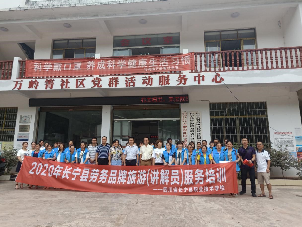 为了进一步提升长宁县全域旅游公共服务能力,促进全县旅游持续稳步发展。为竹海景区培养导游讲解服务人才,帮助广大民工提升职业技能水平,根据《宜宾市人民政府办公室关于印发宜宾市职业技能提升行动实施方案(2019-2021年)的通知》(宜府办发〔2019〕19号)和我县职业技能提升行动工作要求,发挥我校劳务培训基地的优势,由长宁县农民工服务中心主办、竹海镇政府农工办协助,长宁县职业技术学校承办的竹海镇劳务品牌导游讲解综合服务培训班于2020年7月9日在竹海镇万岭箐社区党群活动服务中心二楼会议室正式开班。