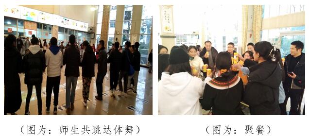 随着一曲曲彝族庆歌的播放,同学们邀请领导、老师跳起了欢快的达体舞,庆祝活动达到高潮。随后,师生开始共进晚餐,在音乐《祝酒歌》中学校领导、老师为同学们送上最真挚的祝福与美好的愿望,同学们也纷纷给领导、老师送上真诚的感谢与浓浓的祝福。大家一边谈笑风生,一边品尝美食,庆祝活动在一派和谐的浓情聚餐中落下帷幕。