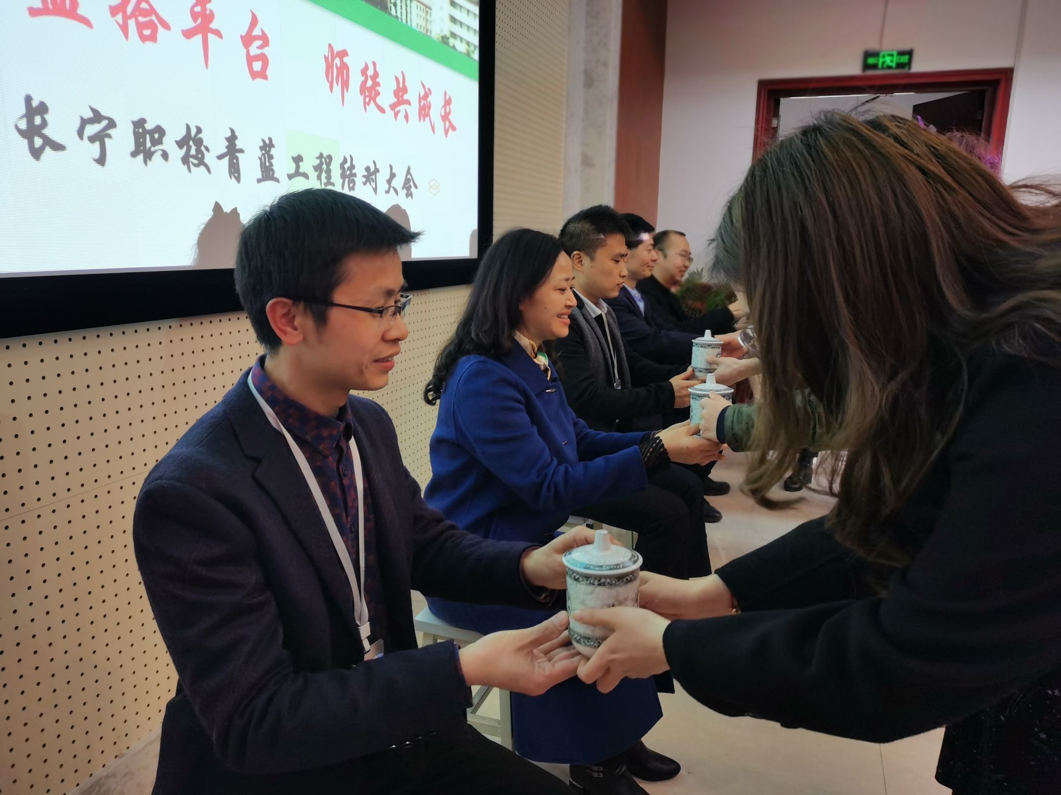 第五项,拜师仪式。新教师向自己的指导老师敬茶,以表达自己尊师、感谢之情,指导老师也向相对应的新老师赠送带有赠言的笔记本。紧接着,校领导为指导老师颁发聘书。