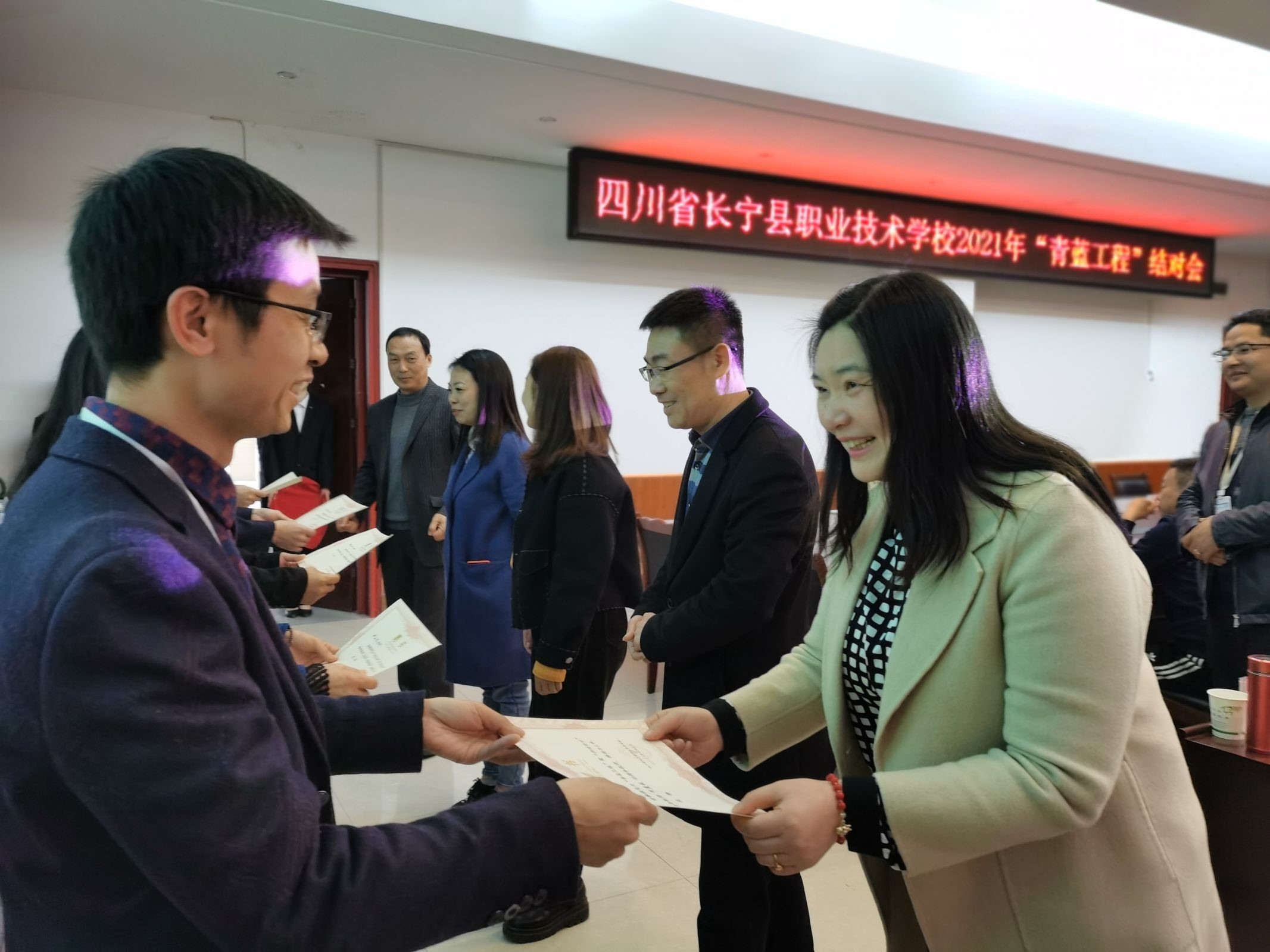 为了使我校青年教师脱颖而出,早日成长,为学校可持续发展奠定人才基础,进一步提高学校教育教学质量。学校于2021年3月4日下午4:20在明达厅召开了“青蓝搭平台,师徒共成长”青蓝工程结对会。参加本次会议的有:所有校级领导、各处室主任、教科室相关人员、5位新进教师及其对应指导老师。