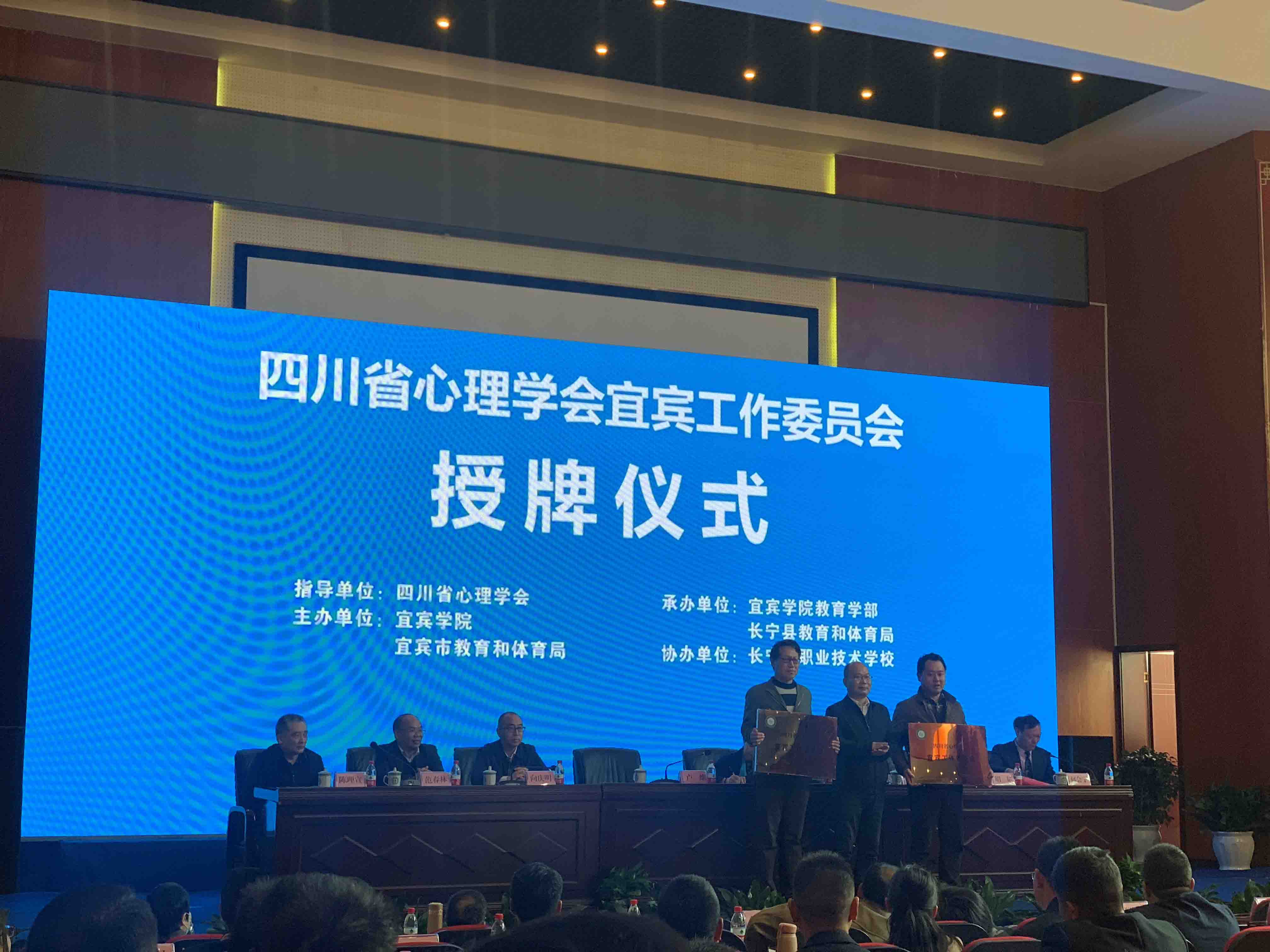 第三项,举行授牌仪式。四川省心理学会给宜宾工作委员会(宜宾市教体局、宜宾学院)、长宁县、高县、筠连县、四医院等四个工作站授牌。