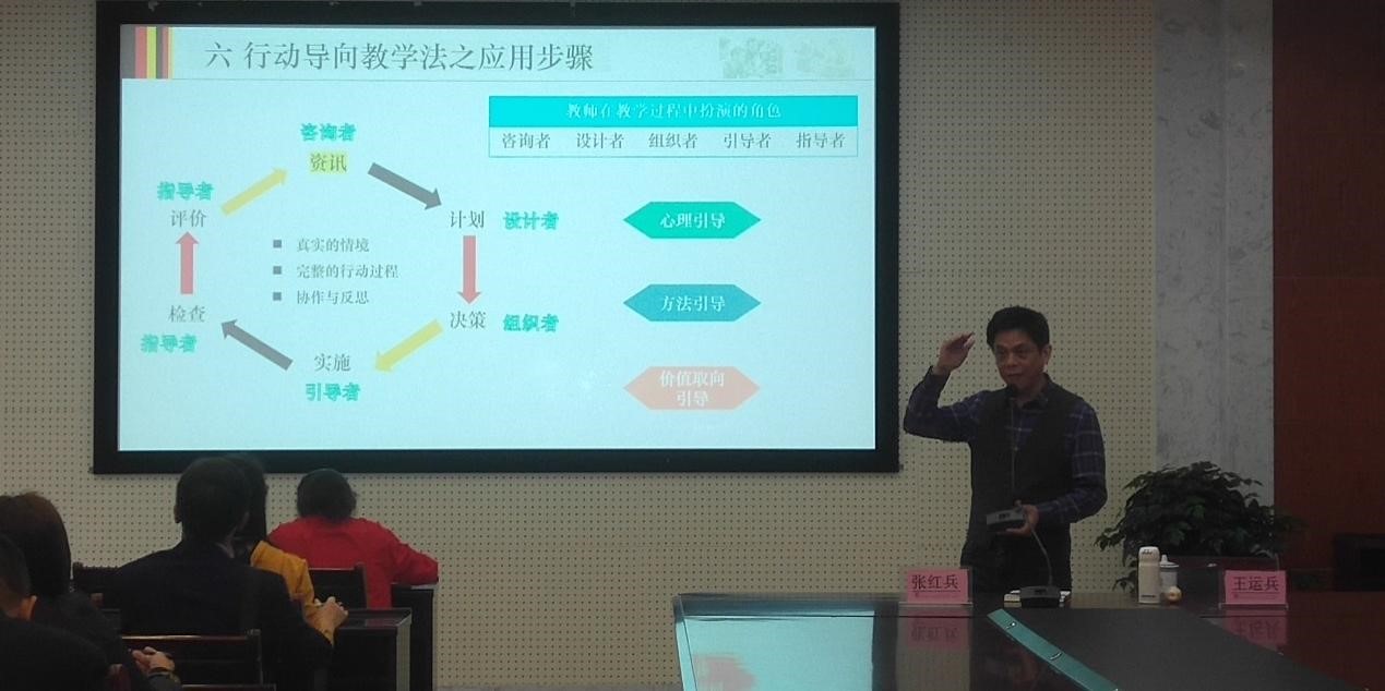 张红兵教授从德国职业教育的现状和德国人民对职教的意识展开讲座,首先告诉我们什么是教育,再从职业教育定义到具体行动导向教学方法介绍,娓娓道来。讲座中,张教授围绕行动导向教学法的定义及其理论基础,方法过程、应用步骤、主要方法、社会形式、行动形式等几方面详细讲解,呼吁我们职业教育应为了行动而学习,通过行动来学习。张教授还反复强调:不要把简单的事情复杂化了。最后,张教授用古诗“长风破浪会有时,直挂云帆济沧海”结束了本次讲座。整个讲座内容详实而充满诗意,让人回味无穷。