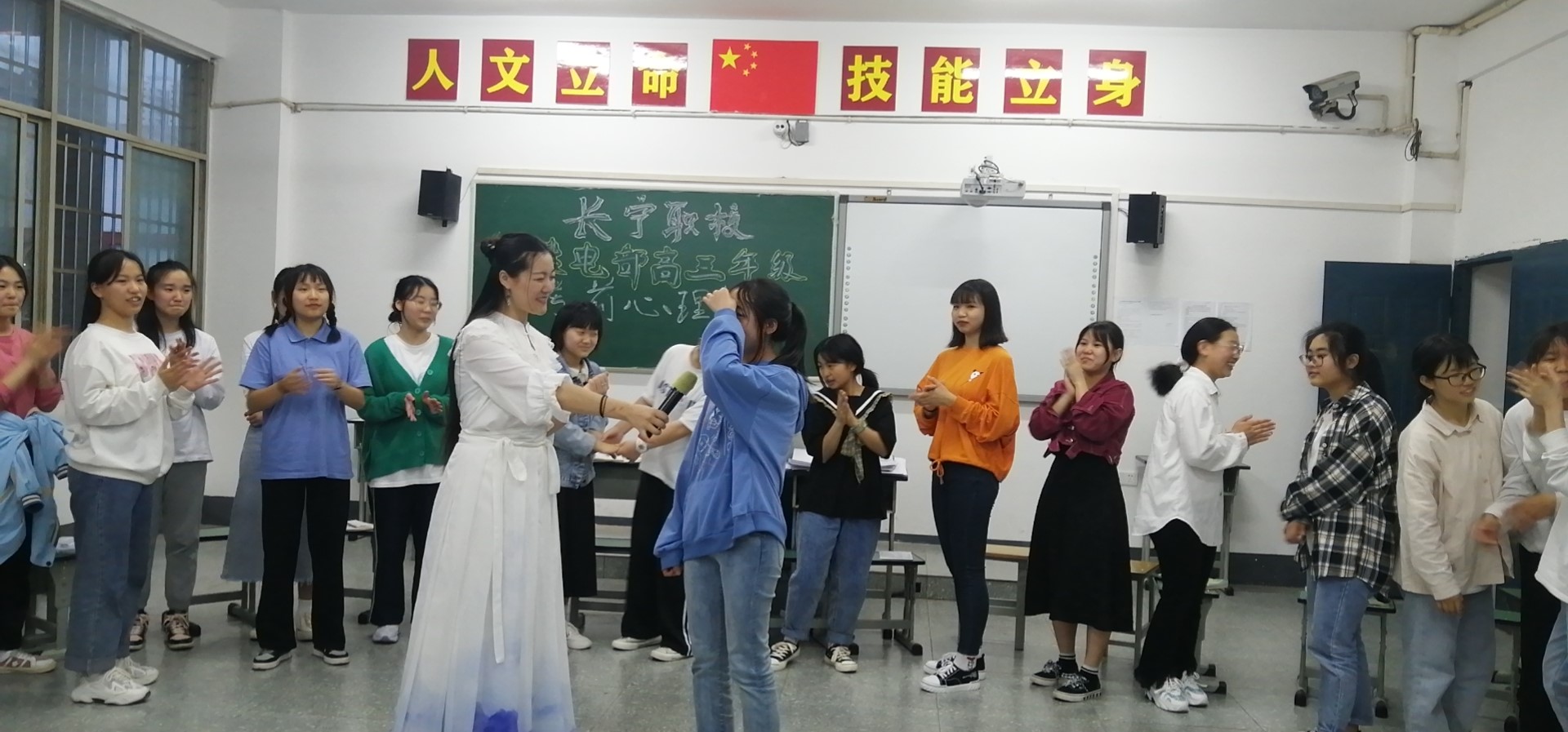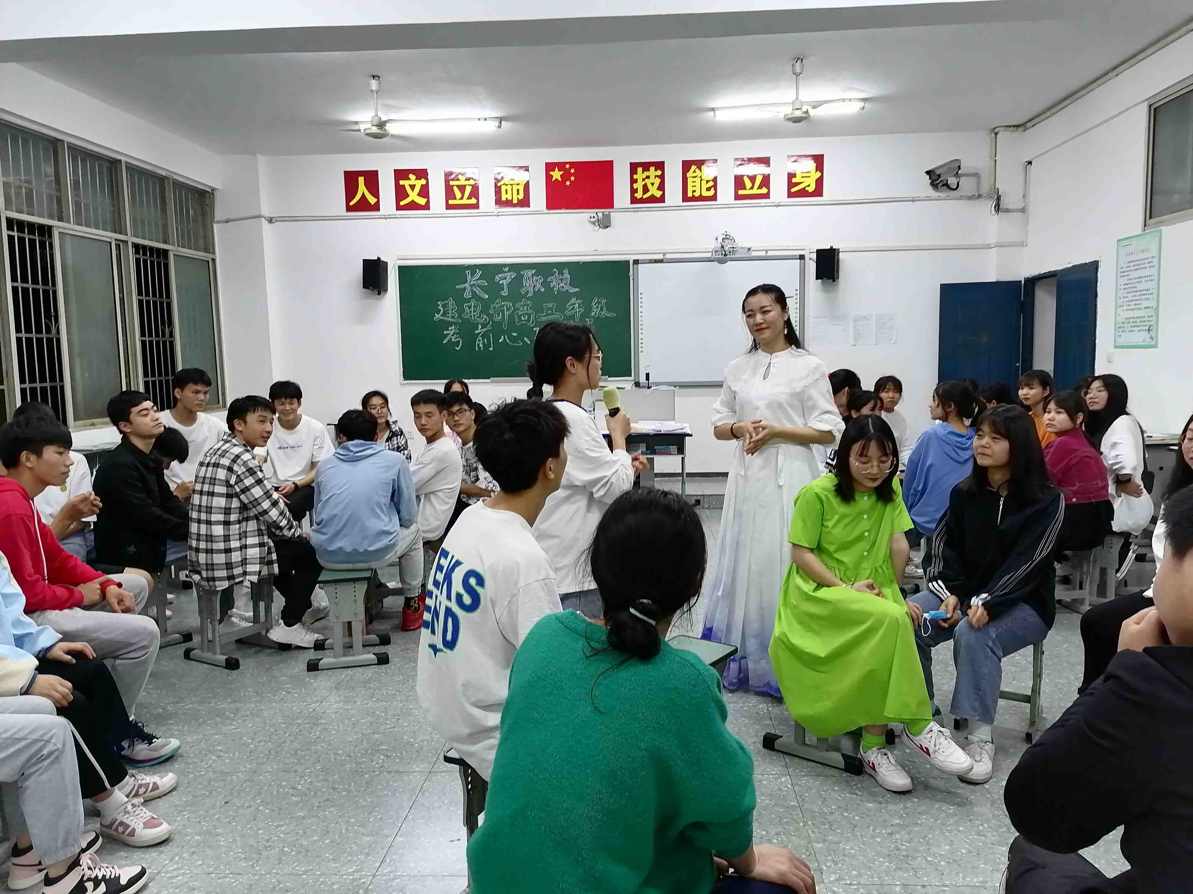 根据省教厅的安排,信息技术二类、土木水利类、农林牧渔类技能高考将在2021年5月7-9日举行,为了让孩子们不要受意外因素的困扰、盲目担心焦虑,要相信自己,保持良好心态,从容应对技能高考,我们于2021年4月27日晚上,邀请了心理健康咨询室蒋宇老师和赵旭娇老师为建电部全体高三学子开展了高三年级考前心理辅导活动,活动在学校心理健康活动室进行。