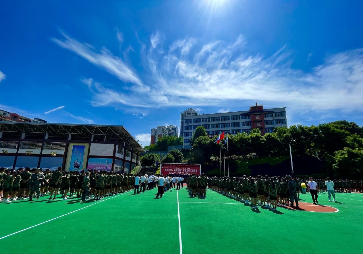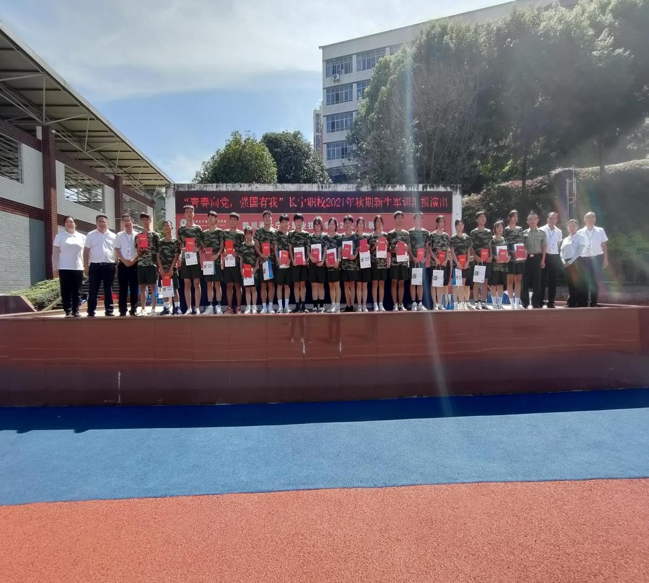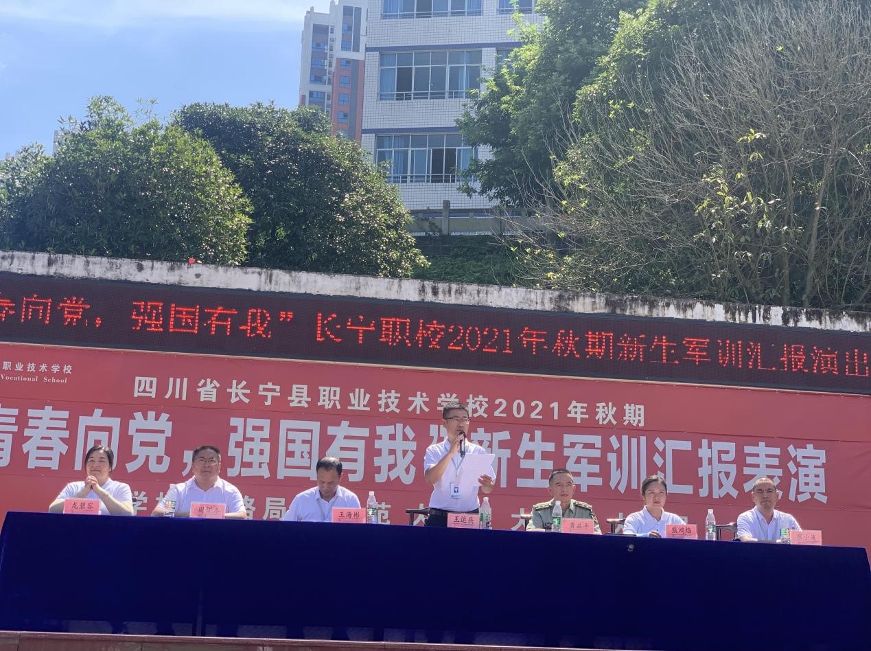 2021年9月10日下午,长宁职校新入学的2021级新生经过为期5天的军训后,在运动场上进行了汇报演出。